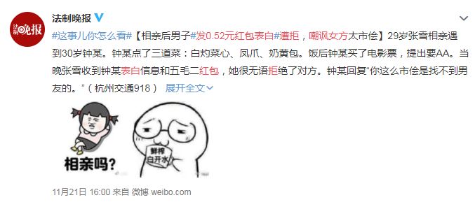 都說相親見三觀,最近有個女生在相親後,收到五毛二的紅包,聯想相親時對方的一系列舉動,就婉拒了男生。