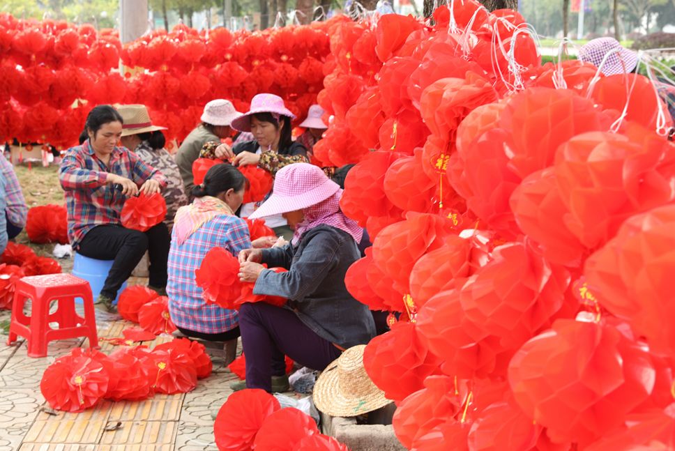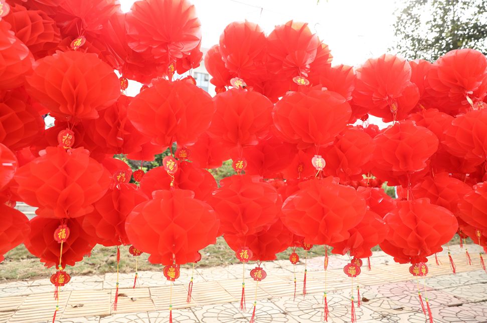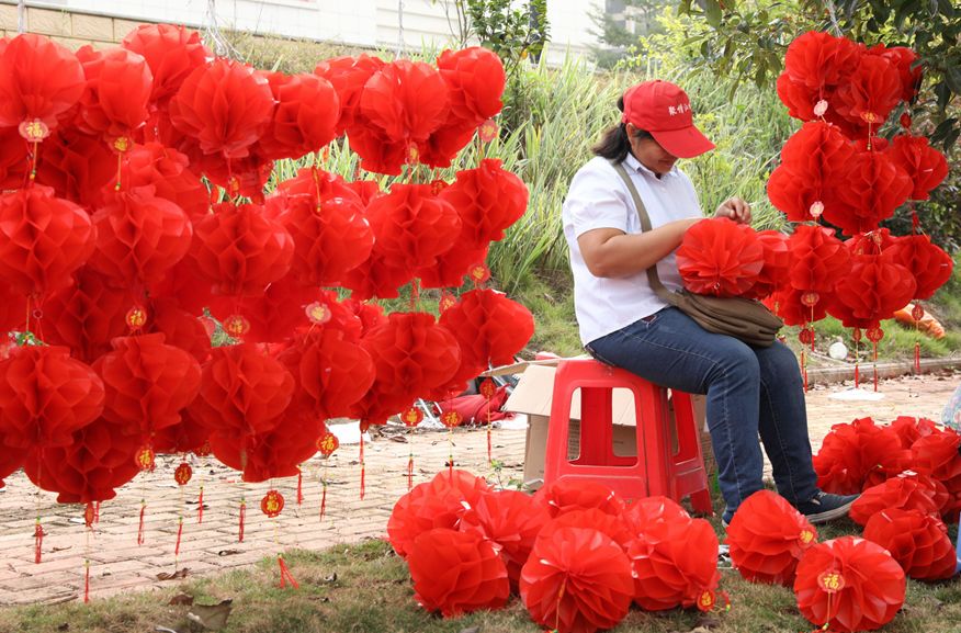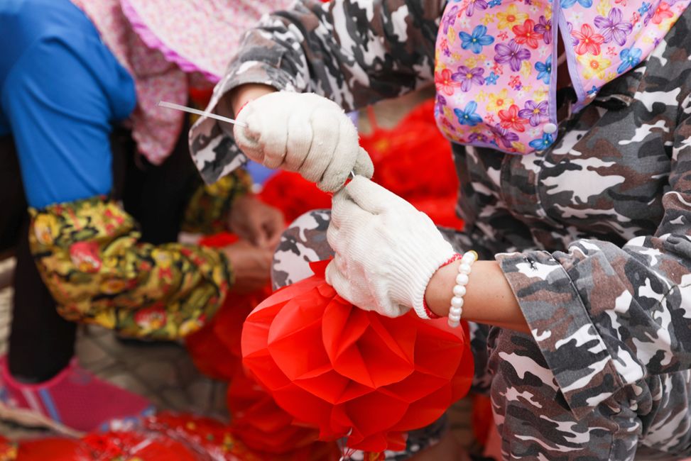 一點一點將燈籠串好掛在一旁