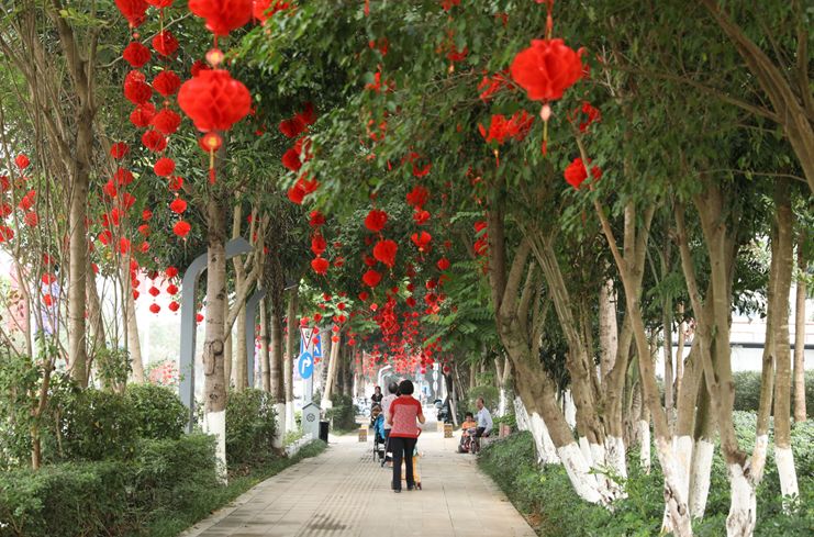 崇左各個街道的綠化樹上多了紅彤彤的色彩