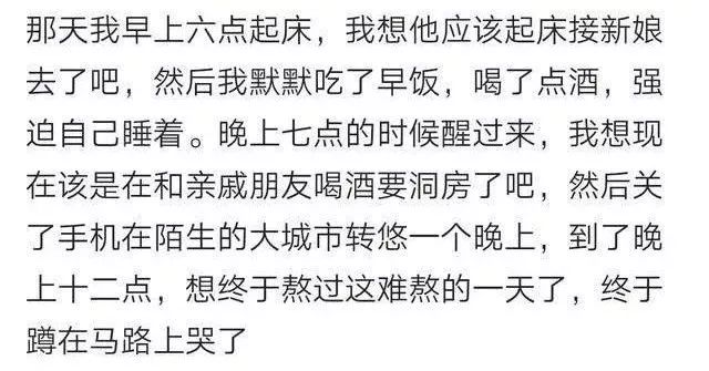 ▼他結婚那天,我六點就起床了,不停地想每個時間點他的婚禮進行到哪個環節了,終於熬到了晚上十二點,這一天過去了,我蹲在馬路邊哭了…