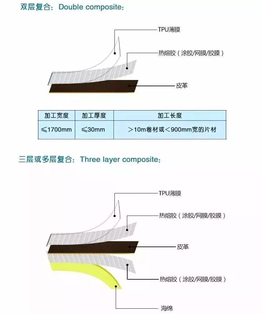 國際上流行的6種復合工藝,即熱溶膠粉點塗層復合工藝、熱溶膠漿點復合工藝、熱溶膠撒粉復合:工藝、熱溶膠雙點復合工藝、聚胺脂噴塗復合工藝、聚胺脂滾塗復合工藝復合的面料,是較新型被市場所開發的一種面料,簡而言之,就是兩種面料復合在一起的面料。