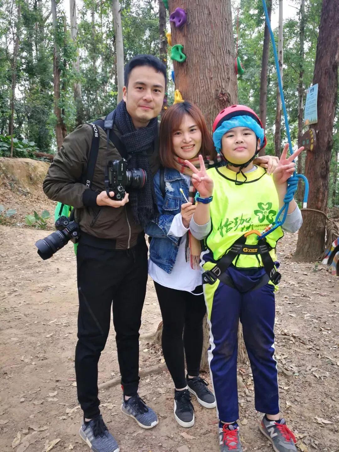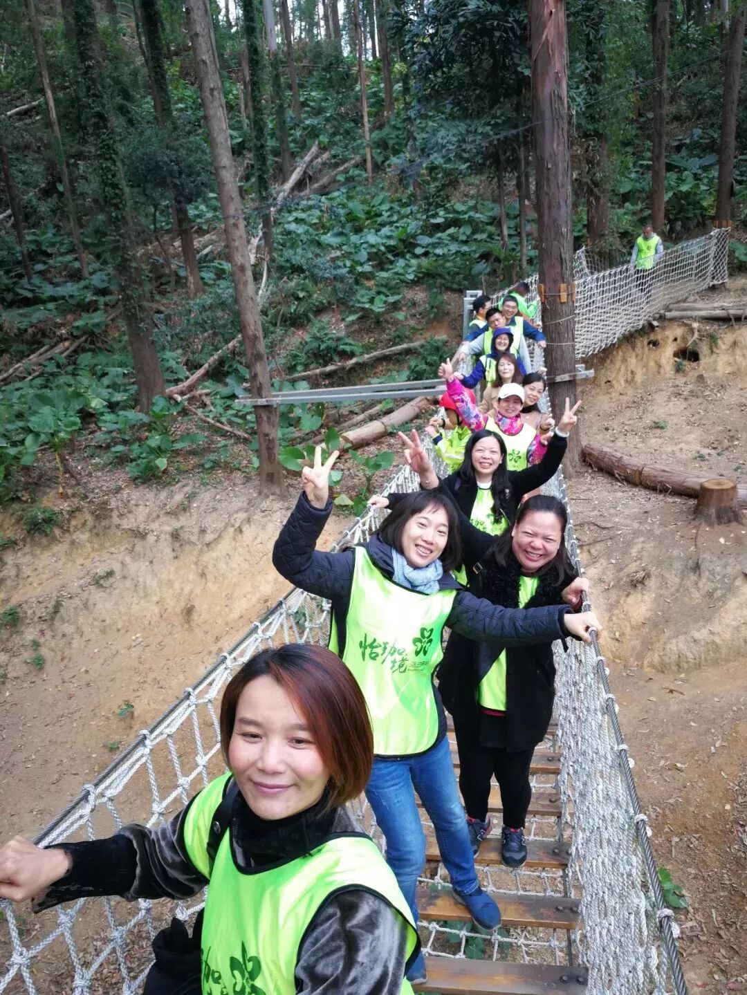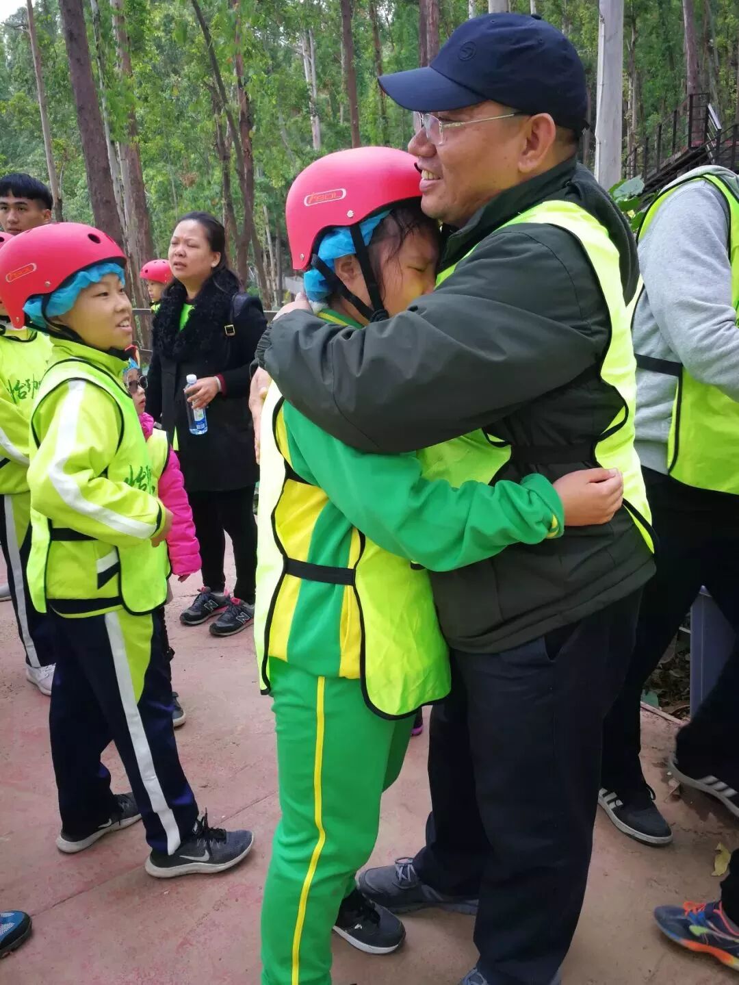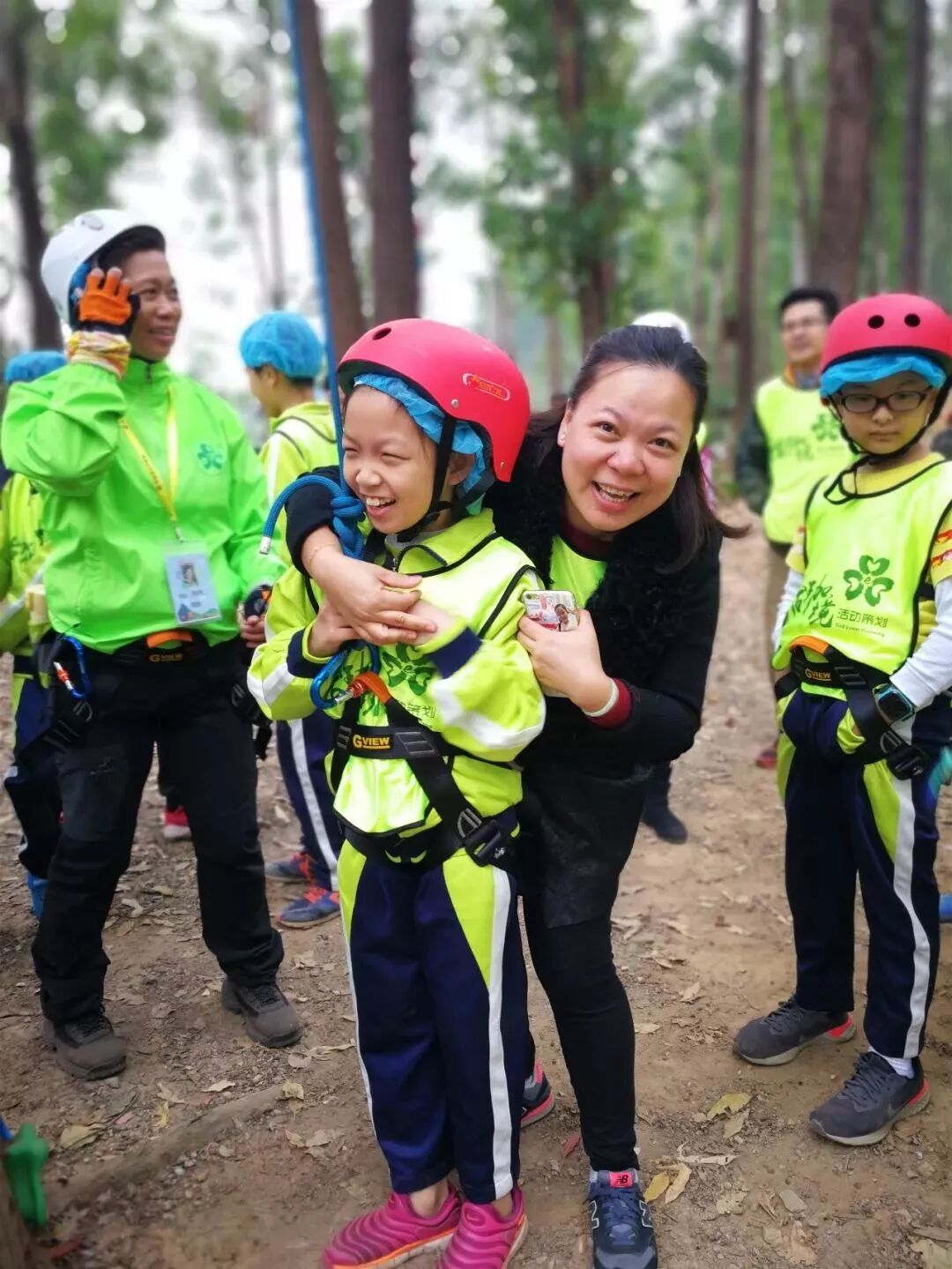 樹攀結束後,工作人員開始讓我們穿上安全褲,戴上安全帽,準備下一項挑戰!這不是一個人在戰鬥!因為同學們要依次排隊逐一過關,站在高空做任務的時候,即便你很恐懼,但是心中仍有一句話:只要邁出了腳步,就沒有退路。這項挑戰不僅考驗同學們的膽量,還鍛煉大家的團隊意識!每個人都要跟上腳步,但是也不能急於求成,不能打亂前面同學的節奏。當然,在高空中,大家都相互鼓勵,前面的同學把經驗傳授給後面的小夥伴,大家有說有笑就不害怕啦!這個遊戲我們全班都勇敢通關!就連工作人員也佩服我們的膽量!當我們成功落地的時候,爸爸媽媽還有王老師都會和我們擁抱,擊掌,我們都特別自豪!允樂班就是這麼一個團結的勇往直前的班級!