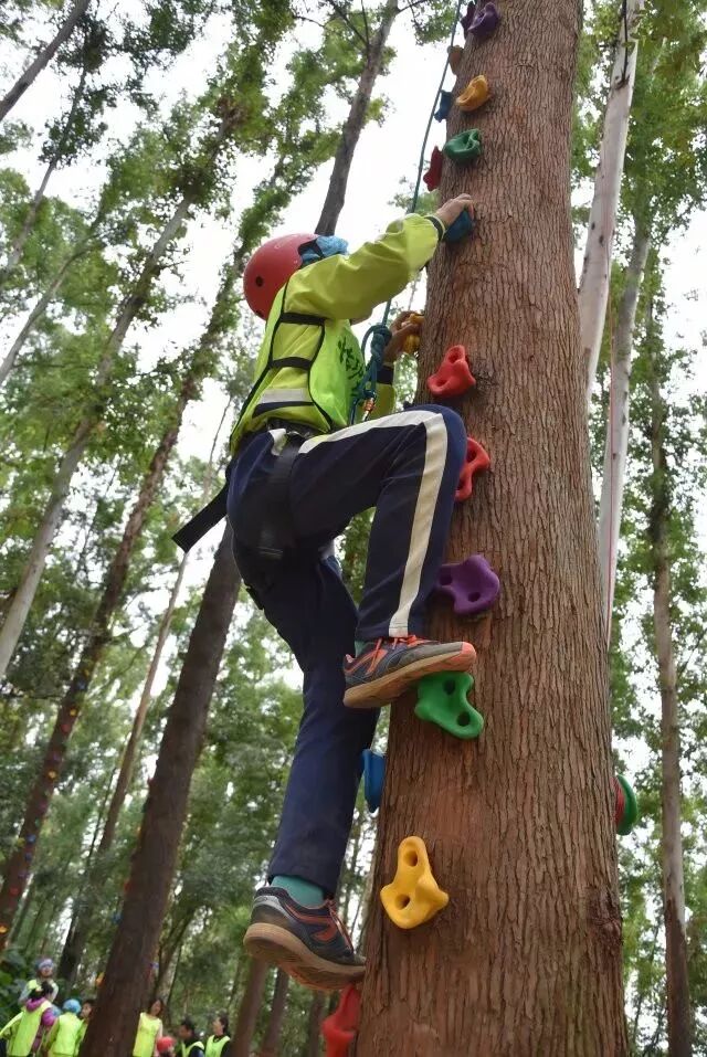 接著重頭戲來了,我們進行了第一個遊戲「樹攀」。攀巖可能很多人都玩過,可是在樹上攀巖大家都表示是第一次。既然是第一次,就有人興奮,有人恐懼!所有同學都勇於挑戰,大部分同學超越自我,有人甚至在15秒內就攀到頂端,敲響鈴鐺。當鈴鐺聲響起,仿佛就是勝利的號角,同學們都情不自禁鼓掌祝賀!除了喝彩聲,還有鼓勵的聲音,當有些同學爬到一半力不從心的時候,想要放棄的時候,在樹下,只聽見加油聲,吶喊聲,鼓舞聲響成一片,那一刻,我們允樂班的每一份子感受到的是前所未有的凝聚力!