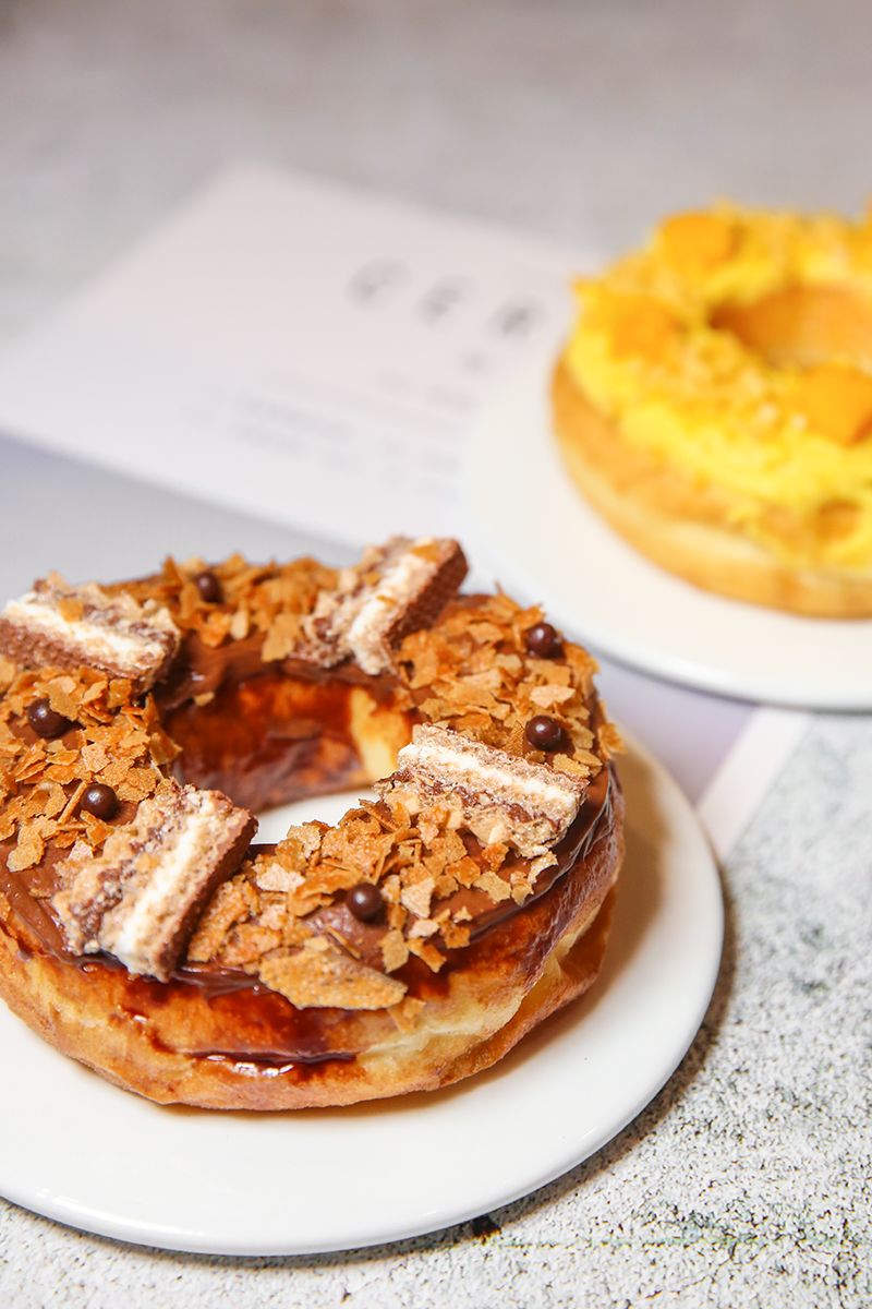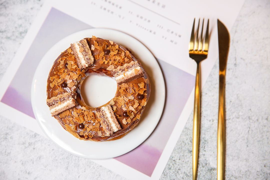 巧克力和甜甜圈向來是天造地設的一對絕佳cp!法芙娜黑巧克力香醇濃鬱,薄脆的德國進口威化豐富了整個口感,可可百利薄脆片和脆珠完美點綴其上,增加層次感,更是為顏值加分。