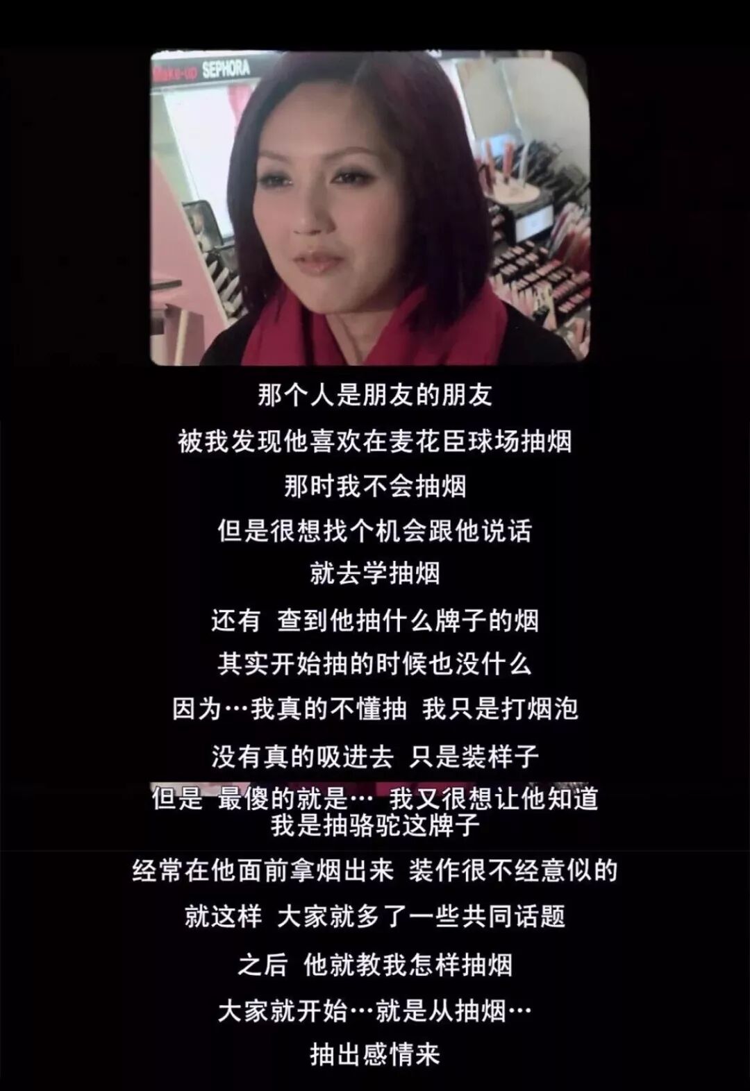 她對著我說,是為了用火機的借口找別人搭話學的抽煙,我對著她狂笑,你真的是為了泡仔什麼方法都想得出來。