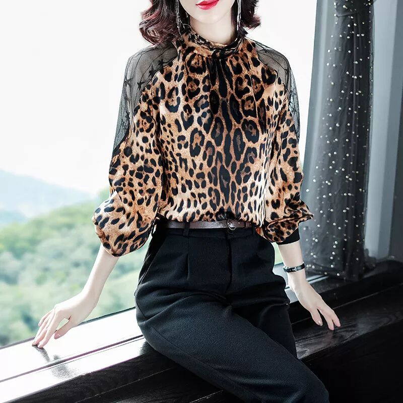 時尚豹紋蕾絲拼接套頭長袖上衣襯衫 貨號QMY8073