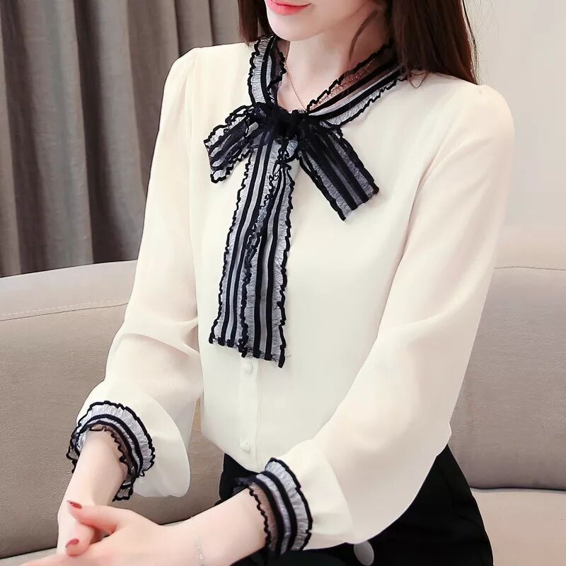 2019春裝新款韓范襯衣女長袖蝴蝶結系帶百搭白色雪紡襯衫ALW8119