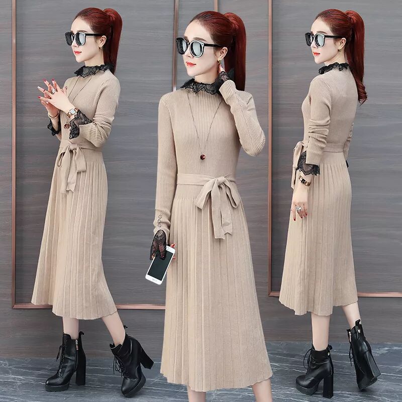 蕾絲拼接長袖中長百搭打底裙冬季新款修身針織毛衣裙HT9389