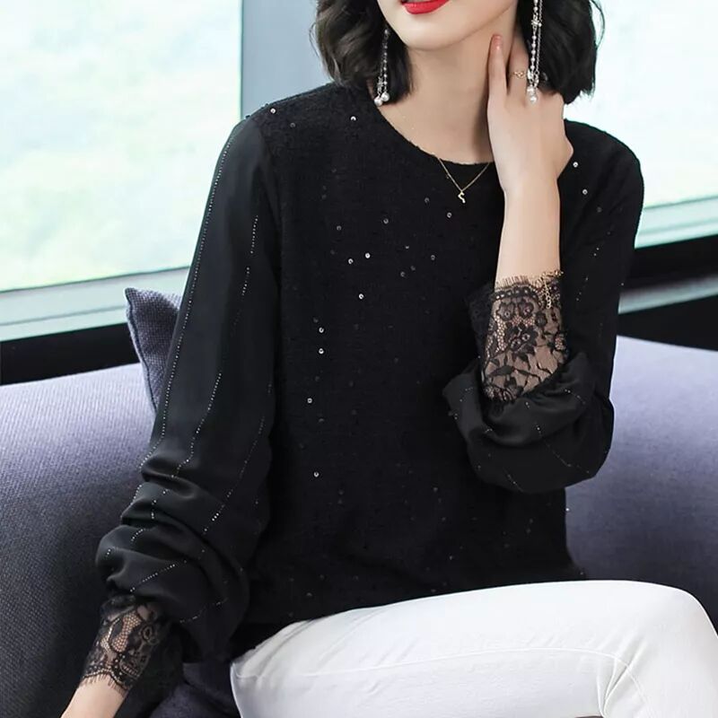 洋氣小衫新款寬鬆亮絲上衣秋冬加絨蕾絲打底衫HT0199