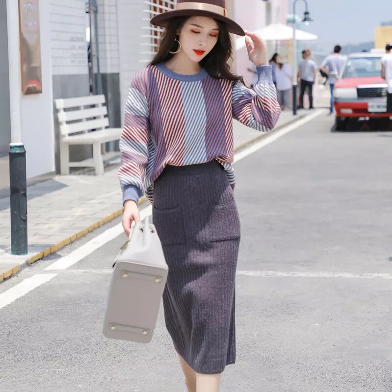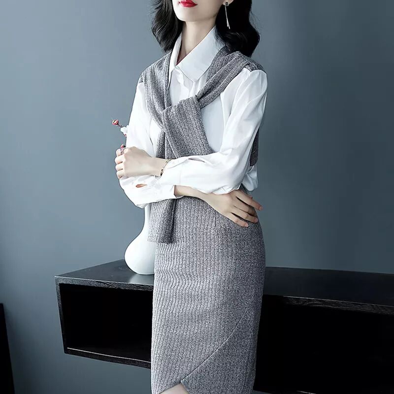 秋冬新款針織拼接襯衫包臀修身半身裙針織套裝HL6886