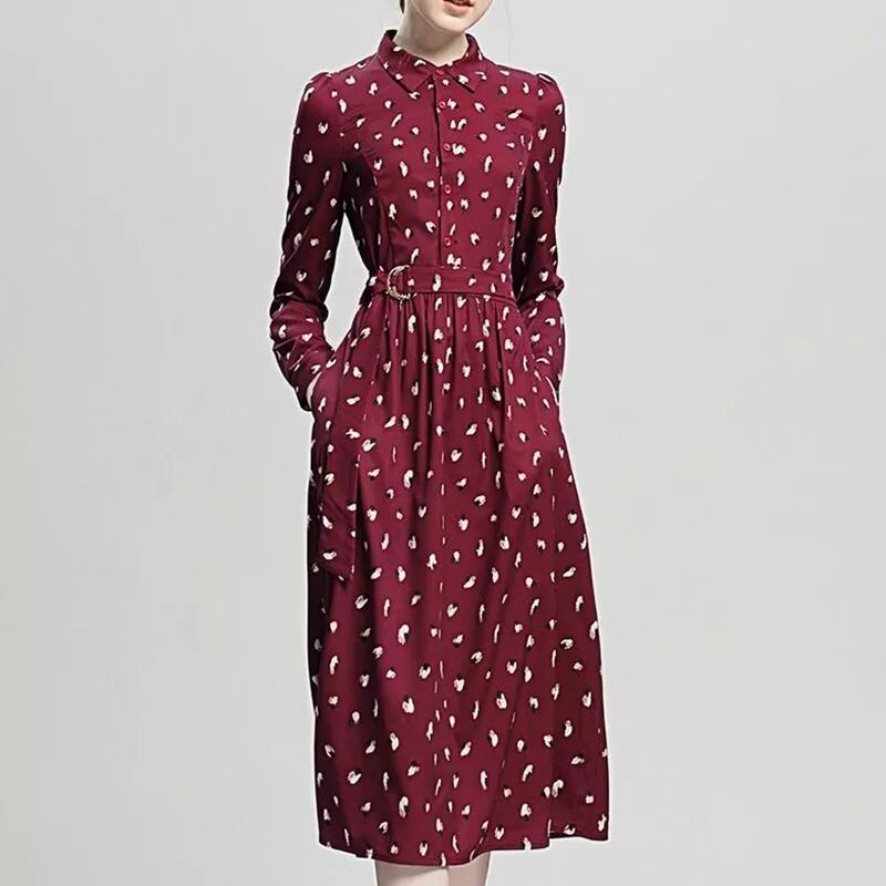 簡潔大方氣質收腰酒紅碎花襯衫式長袖女裝裙子OM20025