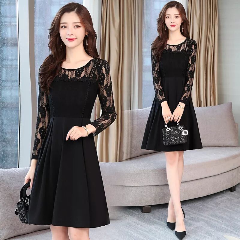 2019春季新款長袖花邊拼接蕾絲連衣裙收腰顯瘦中長款大碼女裝ALW5021