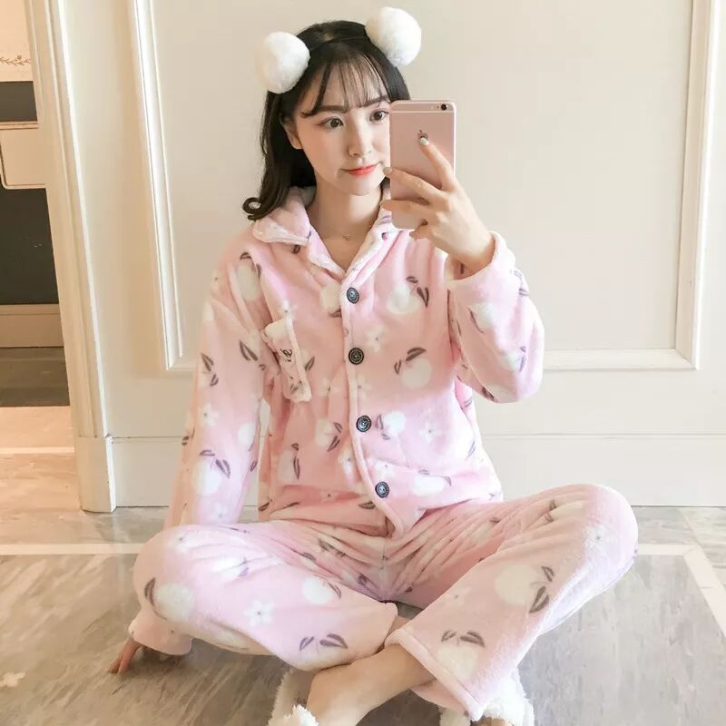 綿柔舒適開衫翻領法蘭絨加厚可愛印花女士睡衣家居服XMY718