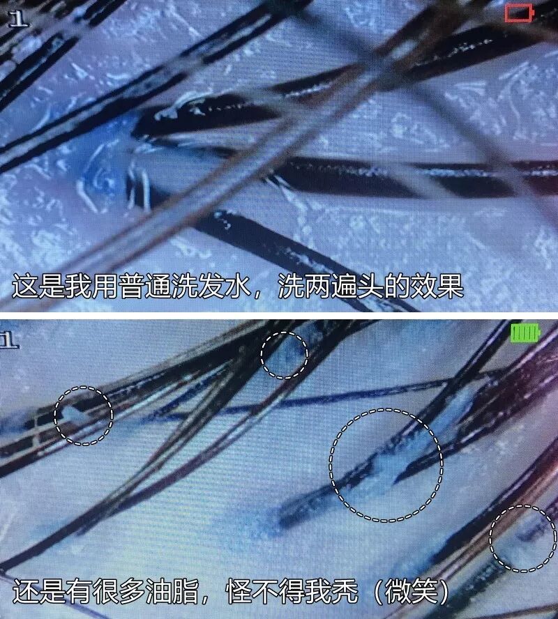 先來看看效果,這兩張圖,是我用其他洗髮水,洗了兩遍後拍的高清圖。可以看到,還是有很多殘留的油脂洗不乾淨。