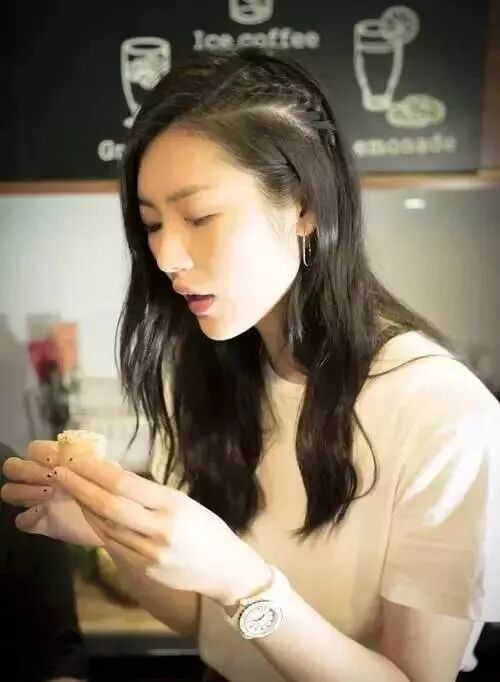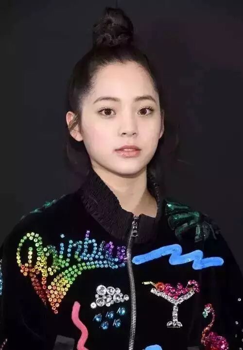 歐陽娜娜這一款高紮的麻花丸子更可愛,預留出一縷頭髮,編成麻花,將其餘的綁成丸子頭後,用麻花辮纏繞在丸子頭上。