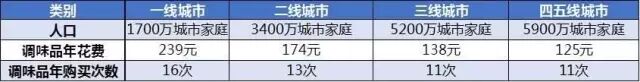 大陸各線城市人口、調味品年花費及調味品年均購買次數一覽表