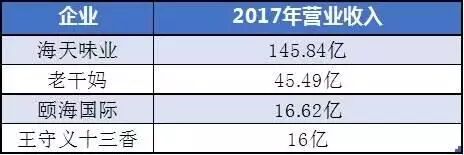 大陸主要的復合調味品代表企業包括:海天味業、王守義十三香、頤海國際、老乾媽等。從2017年營業收入來看,海天味業依然占據該行業較大的市場份額。