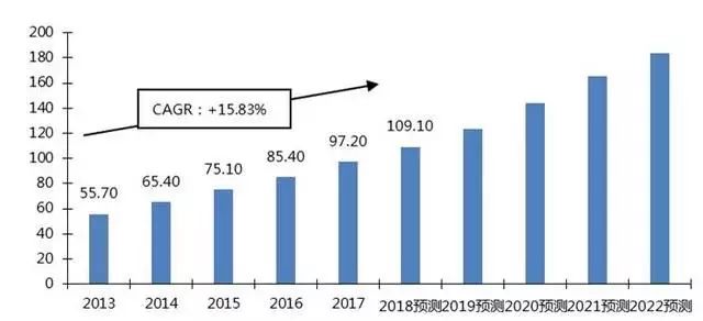 大陸復合調味品市場規模(十億元),2013-2022年預測