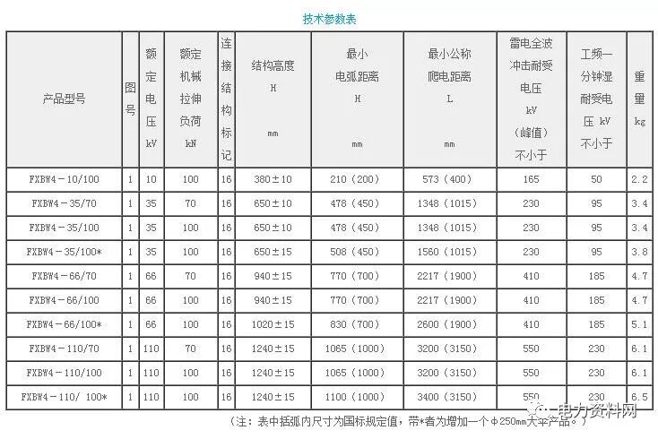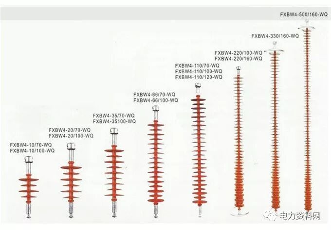 例如,FXBW4-220/100表示棒形懸式復合絕緣子,大小傘型,設計序號4,額定電壓220kV,機電破壞負荷不小於100kN。由於生產廠不同,所編制的產品型號也有所變化。