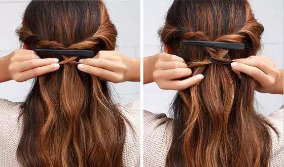 從左側取出相等發量的發束,扭轉,與右側發束在後腦勺匯合。