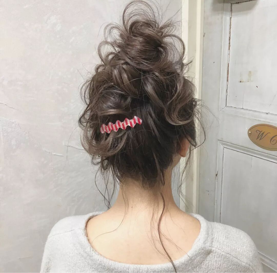 這種呢也簡單,就是編一個麻花辮,然後卷起來,再用梳子吧一些地方挑松散一點,就很自然。