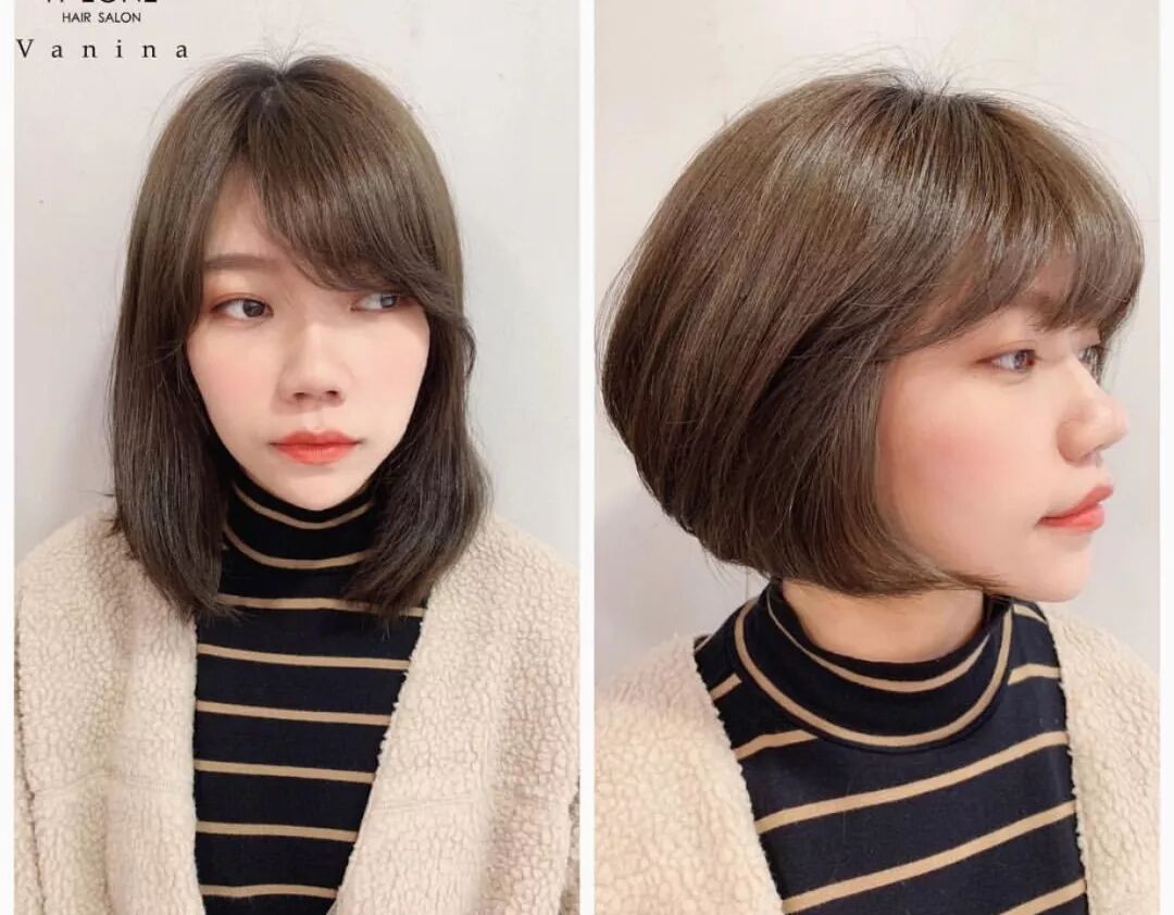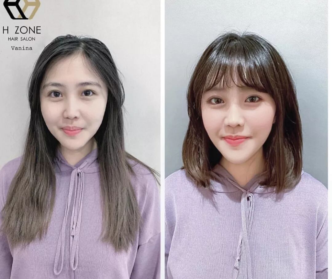 女生顏值並不低,但是改變前的髮型讓他顏值拉低了幾個等級,顯得沒有精神,瀏海部分經過修建之後,顯得俏皮又大方,深棕色發色襯托女生膚色更白皙,瀏海搭配得恰到好處,特別修顏。