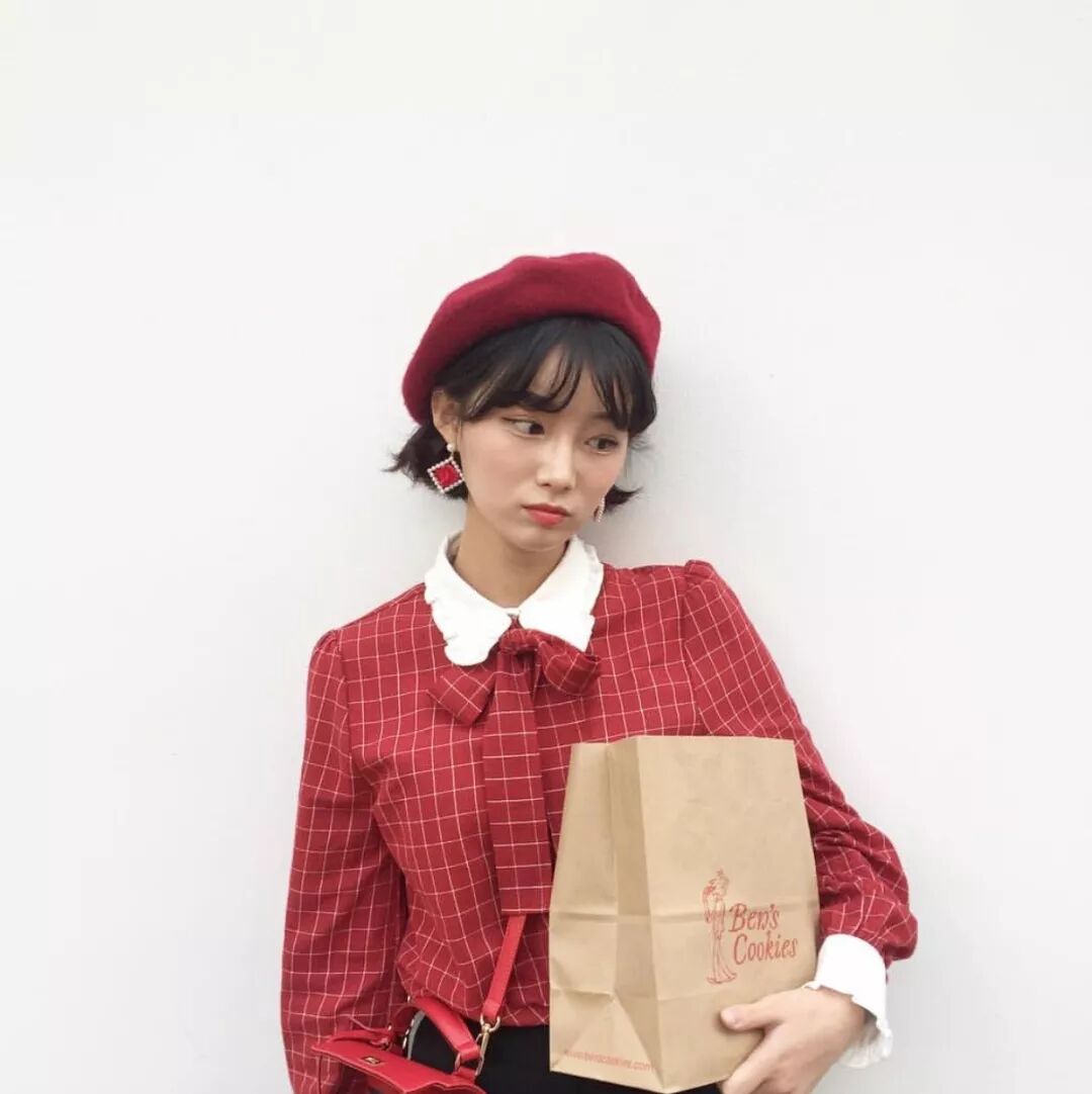 而且這個髮型可是貝雷帽的絕佳CP,搭配一身紅色系穿搭,非常符合新年的氣氛~