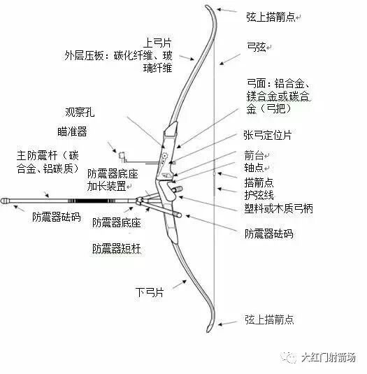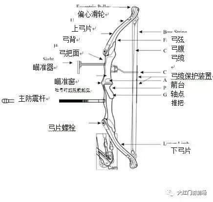 (一)眾所周知,做為現代體育運動中反曲弓射箭項目所採用的弓,是由弓把、弓片、弓弦、箭台、箭側墊、瞄準器和配重減震桿等主要部件組成。復合弓則是由弓把、弓臂、偏心輪、輪軸、弓弦、後視窗、拉力調整螺栓、纜索、纜索限位棒、弦滑、箭台、瞄準器、配重減震桿和撒放器組成。反曲弓和復合弓都是通過人為有效一致的開弓,借助弓片的彈力將箭射向目標的運動器材。同樣拉力標準的弓,反曲弓的弓檔拉得越長,拉力就越大,射出的箭也就越遠。而復合弓則是利用在上、下弓片頂端固定位置上安裝不同形狀的偏心輪和定滑輪(多數射準類型的復合弓普遍採用上下對稱的偏心輪),將定位長度纜索和弓弦固定在滑輪定位銷上和通過滑輪槽安裝適當長度的弓弦,從而借助偏心輪的杠桿原理,把拉力較重的弓拉開。拉開後的弓則根據不同形狀的偏心輪,最終將減輕拉力65-75%。也就是說,復合弓的開弓力量要大,拉開後的弓,其對稱力則大大減小。值得一提的是,復合弓的弓檔最長拉距是靠滑輪定位銷和纜索與弓弦的相互制約作用而不改變的。因此同一張弓,其弓檔確定後,拉力一致,從理論上講射出箭的距離也相等。