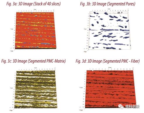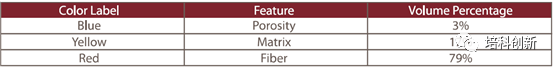 各個片段的結果顯示如下圖。定量過程:尺寸的閾值設置為5μm(長寬高),體積參數抽取出來。使用Image-Pro內置的常規分析模塊可以獲得氣孔,基質和纖維的體積百分比。體積單元的誤差~1%,具體分布值如上表所示。