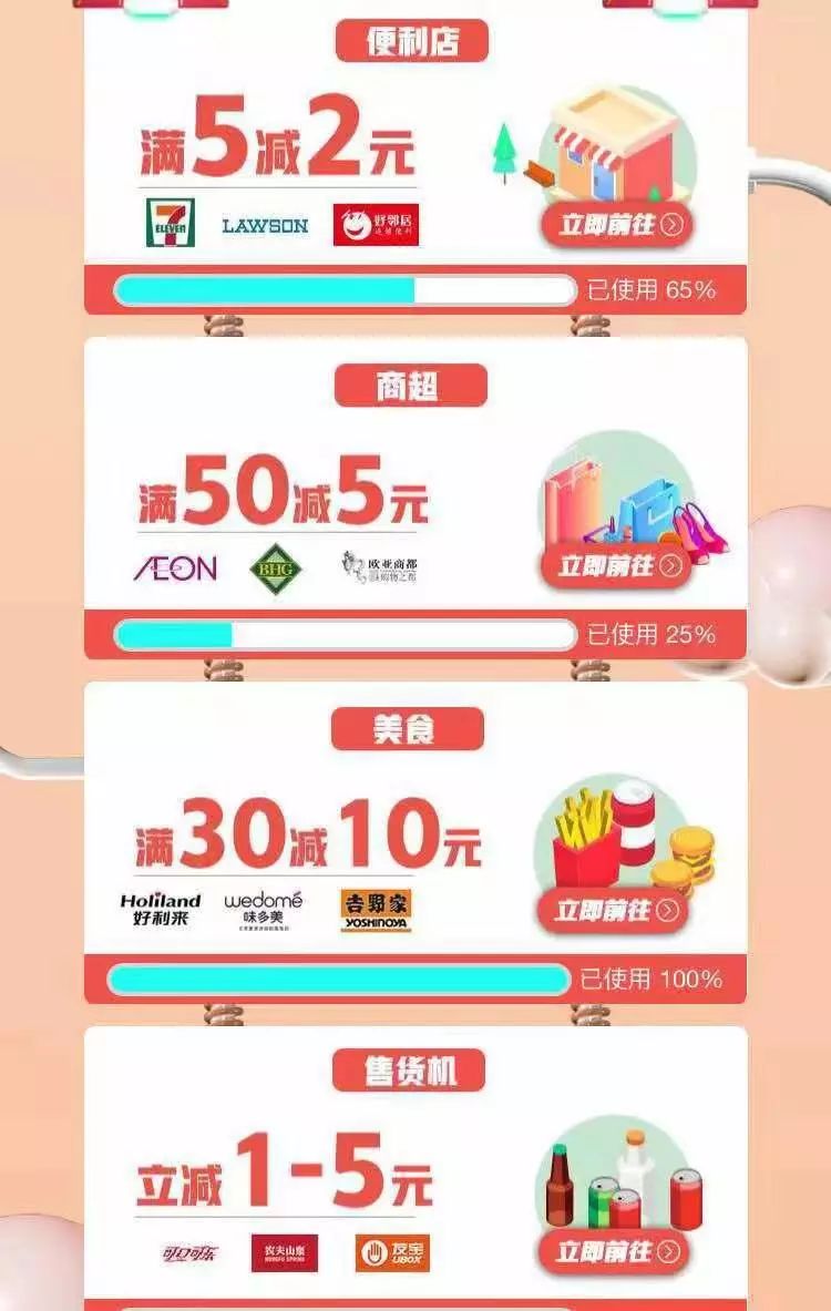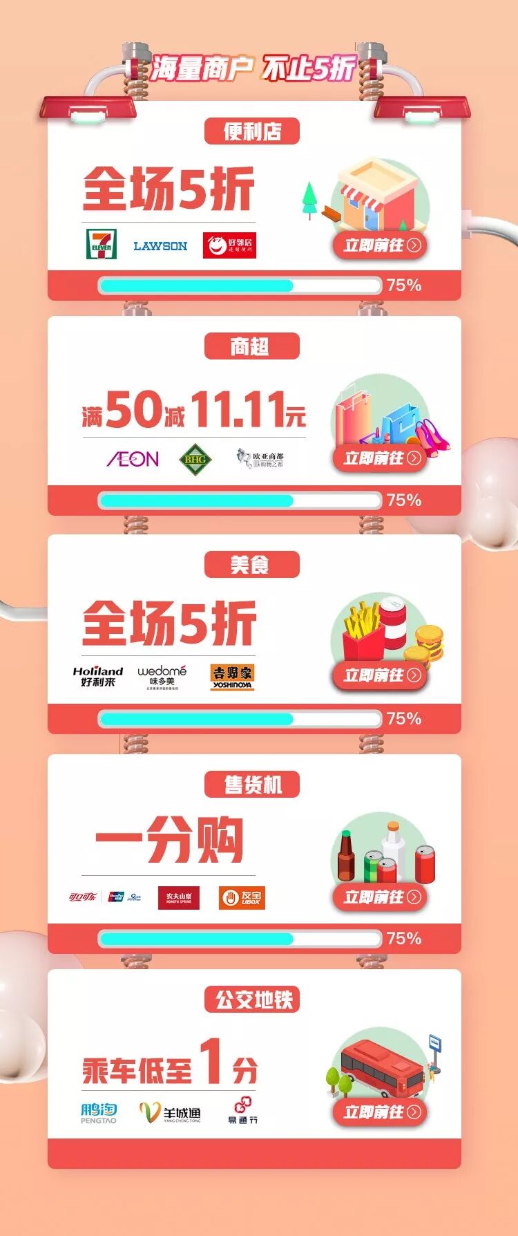 便利店:全場5折(5元封頂);商超:滿50減11.11元;美食:全場5折(15元封頂);售貨機:全民一分購(4元封頂)。以上優惠全部為先到先得,寶寶們出行可要記得用起來哦。