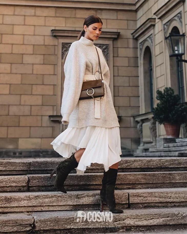喜歡穿著隨性的可以試試這種粗棒針織的毛衣裙,但是這種款式在一定程度上有顯胖效果,所以要配合上一定的露膚才可以穿出最好的效果。