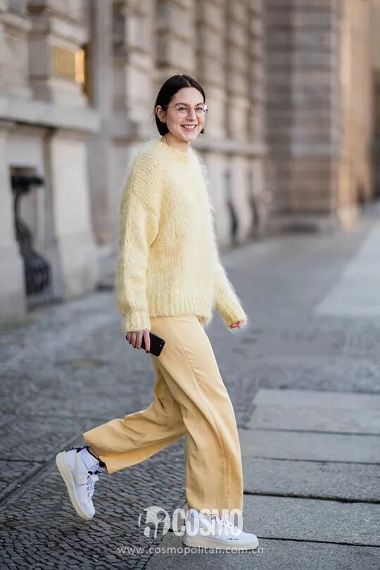 黃色系的針織衫則比較俏皮,馬海毛絨絨的質地溫柔加倍,順色配上鵝黃色闊腿褲,少女感爆棚。