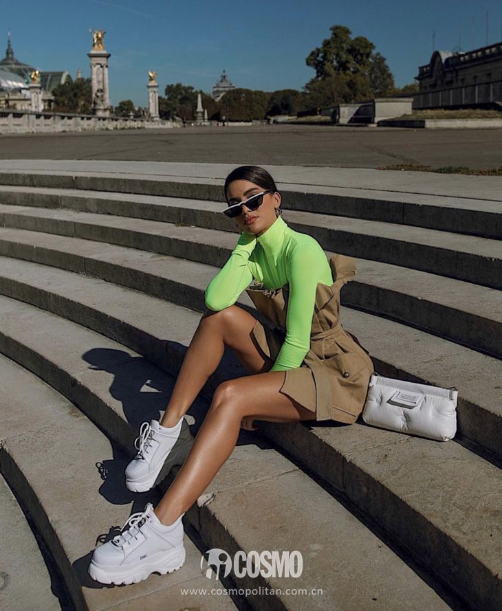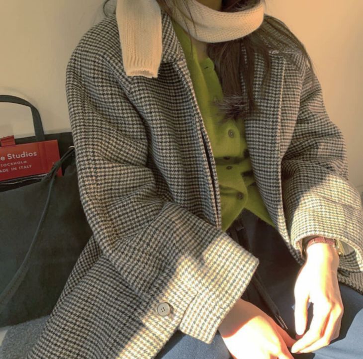 牛油果綠相對於熒光綠來說比較好駕馭,也很可愛,用它做外套的內搭更凸顯濃濃的復古感。