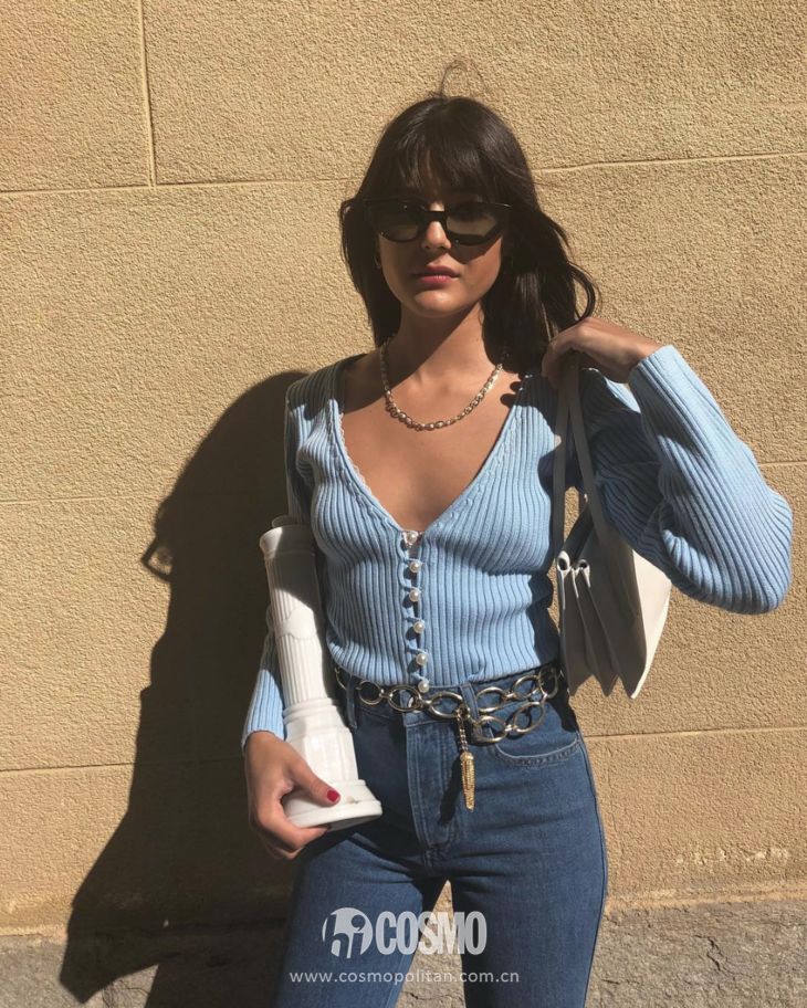 短款的針織開衫就可以沿用Jennie的不好好扣扣子的方法,如果對自己身材很滿意的選手當然可以大露特露,例如Bella女士。