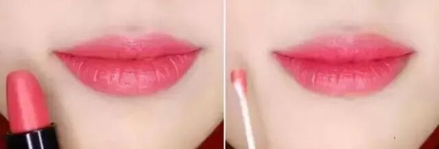 Step 12:抹上粉紅色口紅,雙唇外輪廓處的口紅用棉簽小心擦去。