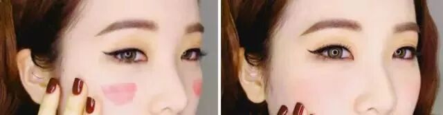 Step 11:兩頰抹上粉紅色口紅作為腮紅,用手指指腹將口紅輕輕暈染開。