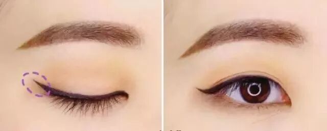 Step 7:用黑色眼線液筆沿著上睫毛根部畫一條眼線,眼尾上翹。