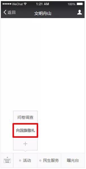 ▼方式二:在文明舟山Line號主界面下方菜單欄,點擊【活動】→【向國旗敬禮】直接進入留言寄語界面,留下你對祖國想說的話。