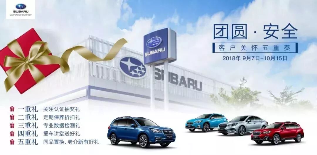 9月7日-10月15日期間,斯巴魯「團圓·安心」活動正火熱進行中,到店即有五重好禮等您拿!