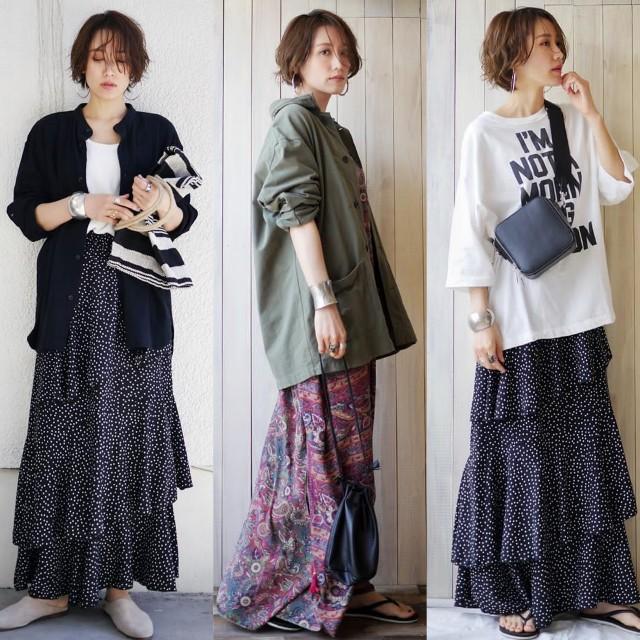 在很多的森系穿搭中,都會出現長裙的搭配,呈現一種極度慵懶的感覺。在第一套搭配中,外搭選擇了一款黑色針織開衫,內搭一件白色T恤,下身再搭配一條深色系的波點半身長裙,盡顯溫柔知性氣息。軍綠色的中長款外套內搭一條波西米亞風的拖地長裙,慵懶隨性,舒適愜意,有一種漫不經心的浪漫感覺。寬鬆版型的白色字母T恤,上身簡約舒適又不單調,下身再搭配一條深色波點長裙,慵懶又舒適。