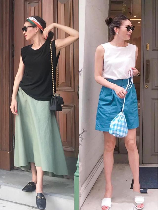 基本款的黑白t恤可以說是利用率極高的了,即使是不關註時尚的人衣櫃裡也會有好幾件作為日常搭配,好穿又百搭,超實用。但是大多數人都是用普通的牛仔褲搭配草草了事,雖然舒適但是太過平淡,要穿出時髦感還得學這個40+的姐姐。她會用明亮卻不刺眼的嫩綠和藍色下裝來提亮造型,還會加入絲巾發帶,有設計感的包包帶來氣氛感,不僅提升了時髦度還很減齡,非常值得借鏡。