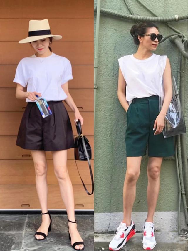 這個博主在挑選單品上也很有一套,尤其在顯高顯瘦上,小個子女生跟著做絕不會出錯。夏天是個穿短褲的季節,在選擇時也是有很多講究的,左側的黑色短褲下擺往外擴散類似於A字裙,不僅遮肉還顯腿部纖細。墨綠色的這條也是寬鬆的設計,直上直下的版型具有很好的包容性,無論是打造運動風還是職場架式都不在話下。她的短褲通常有2個特點:膝蓋上的長度和寬鬆,一個能打造大長腿一個能遮肉顯瘦,超實用。