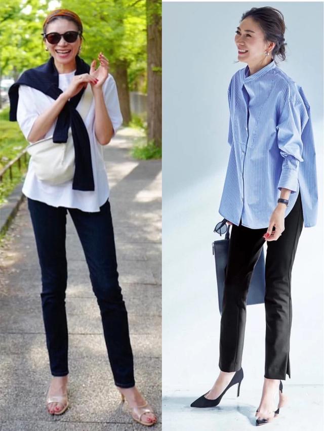 襯衫最能塑造氣質是毋庸置疑的,穿著時選擇寬鬆的版型,休閒隨性又不失氣質感。由於這個博主40+了,很少觸碰太花哨的圖案和設計,常規款的版型穿出來反而更加大氣。這件是經典的藍白條紋,圓領設計不像傳統的襯衫領那麼嚴肅呆板,多了點隨性卻也不會太過休閒。由於上衣已經是寬鬆的版型,下半身最好修身,上寬下緊顯精神也顯腿細。博主用黑色小腳褲與尖頭的細高跟搭配知性又有女生味,非常適合職場女性。需要注意的是想顯腿長最好選尖頭鞋子,整個人看起來也會更加秀氣。