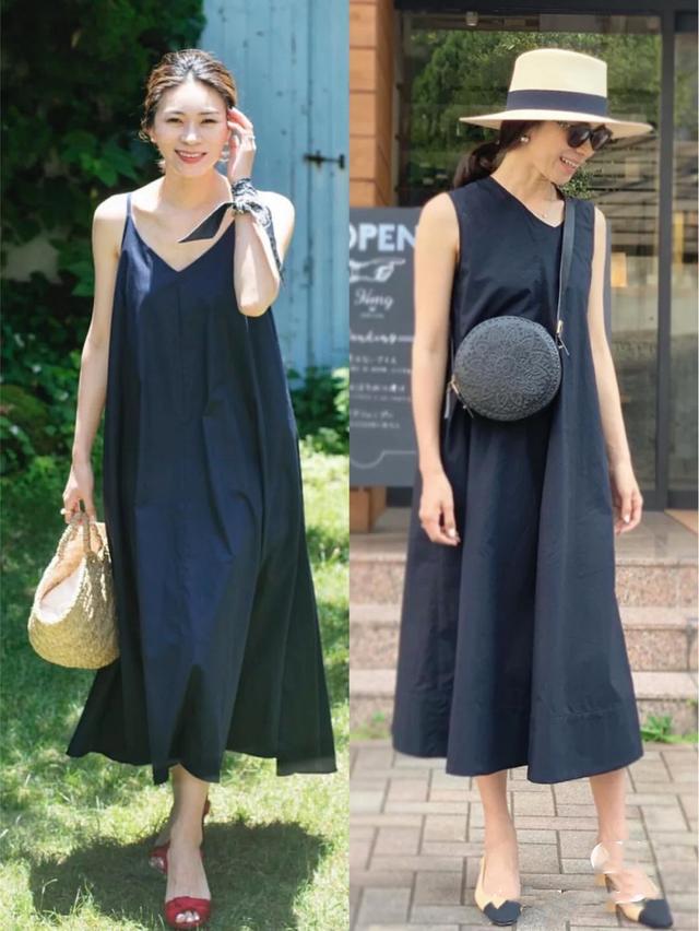 這個博主沒有固定的穿搭風格,偶爾也會換上all black的休閒穿搭。這兩件都是寬鬆的長款A字裙,沒有明顯的腰線又是及踝長度,很容易湮沒身高顯得矮胖,她會從裁剪上或者用配飾化解。一身黑色很容易顯壓抑,她會利用自身的優點,選擇大v領設計的領口,露出深邃的鎖骨性感有吸引力,也能夠拉長頸部看起來更加精神,同時大面積裸露的皮膚也能避免黑色的沉悶感,讓視線往上聚焦而顯修長。所以不管胖瘦,v領絕對是顯瘦又顯精神的設計。除此之外她還用絲巾系在手腕增添浪漫感,或者及腰的挎包讓視線上移,這些小細節看似不起眼,卻能讓格調提升好幾個檔次。