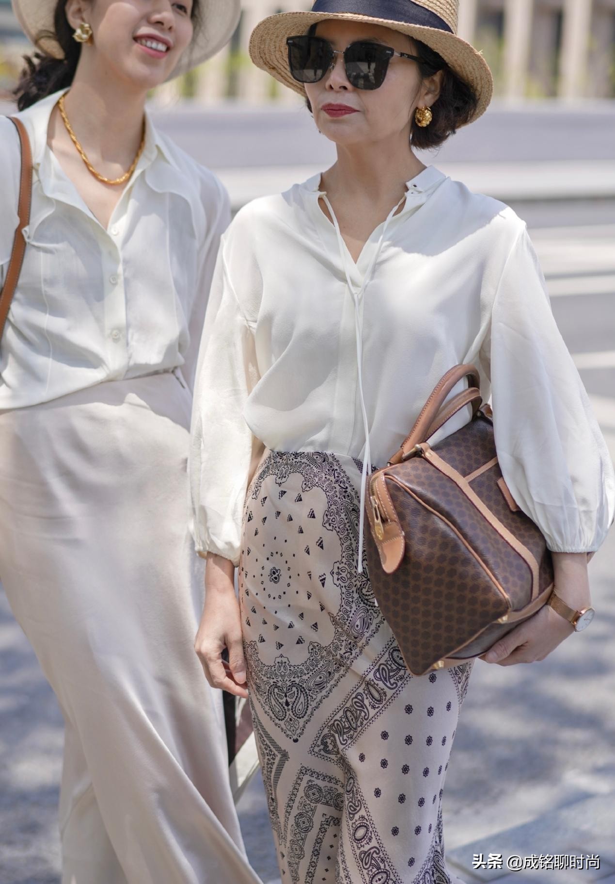 當你下半身的服裝較為龐雜時,白色襯衫也能夠成為過渡的單品使用。例如這組造型用的就是純白色襯衫和印花半身裙的匹配,裙裝可以幫助女生的體型的曼妙感得到展示,五六十歲的女性使用,知性又優雅。