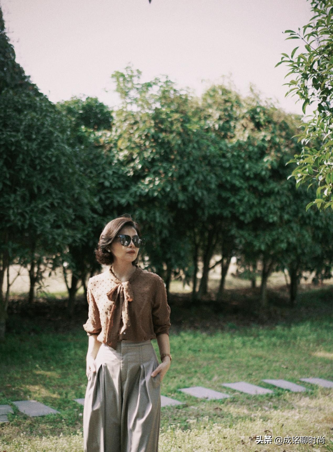 在色彩方面,除了基礎簡約的白色以外,大地色之中的幾種色系也很適合五六十多歲的女士使用,讓她們的內斂美感和沉穩的風格得到呈現。例如這款襯衫,它還加入了飄帶的形成,讓你的著裝不單調,很有層次。