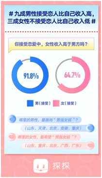 在「男主外、女主內」的傳統文化影響下,男性擇偶時「向下兼容」,女性擇偶「向上兼容」成為常見的現象,但本次調研顯示,91.8%男性接受戀人比自己收入高,接受「戀愛中,女性收入比男性高」的女性僅有64.7%。這意味著男性的擇偶、尋找愛情的觀念,正在發生變化,越來越願意接受新的關係模式。在地區方面,男性最崇尚「男強女弱」的省市TOP 5分別為 山東、天津、北京、安徽、重慶,女性最希望「男強女弱」的省市為山東、重慶、北京、廣西、廣東。