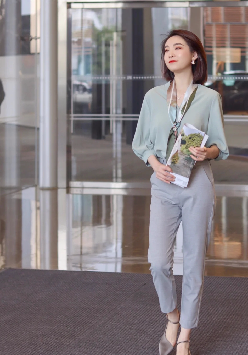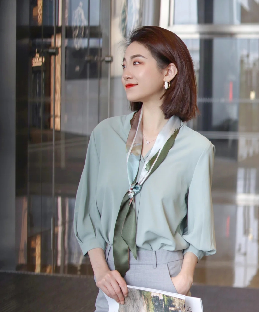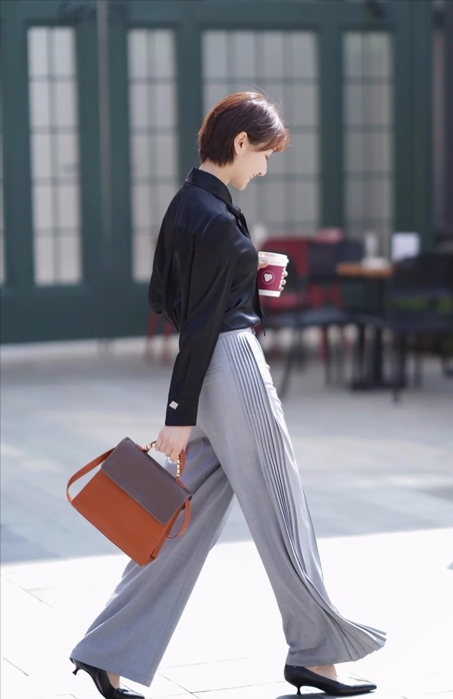 01、純色襯衫+灰色闊腿褲,打破職場沉悶