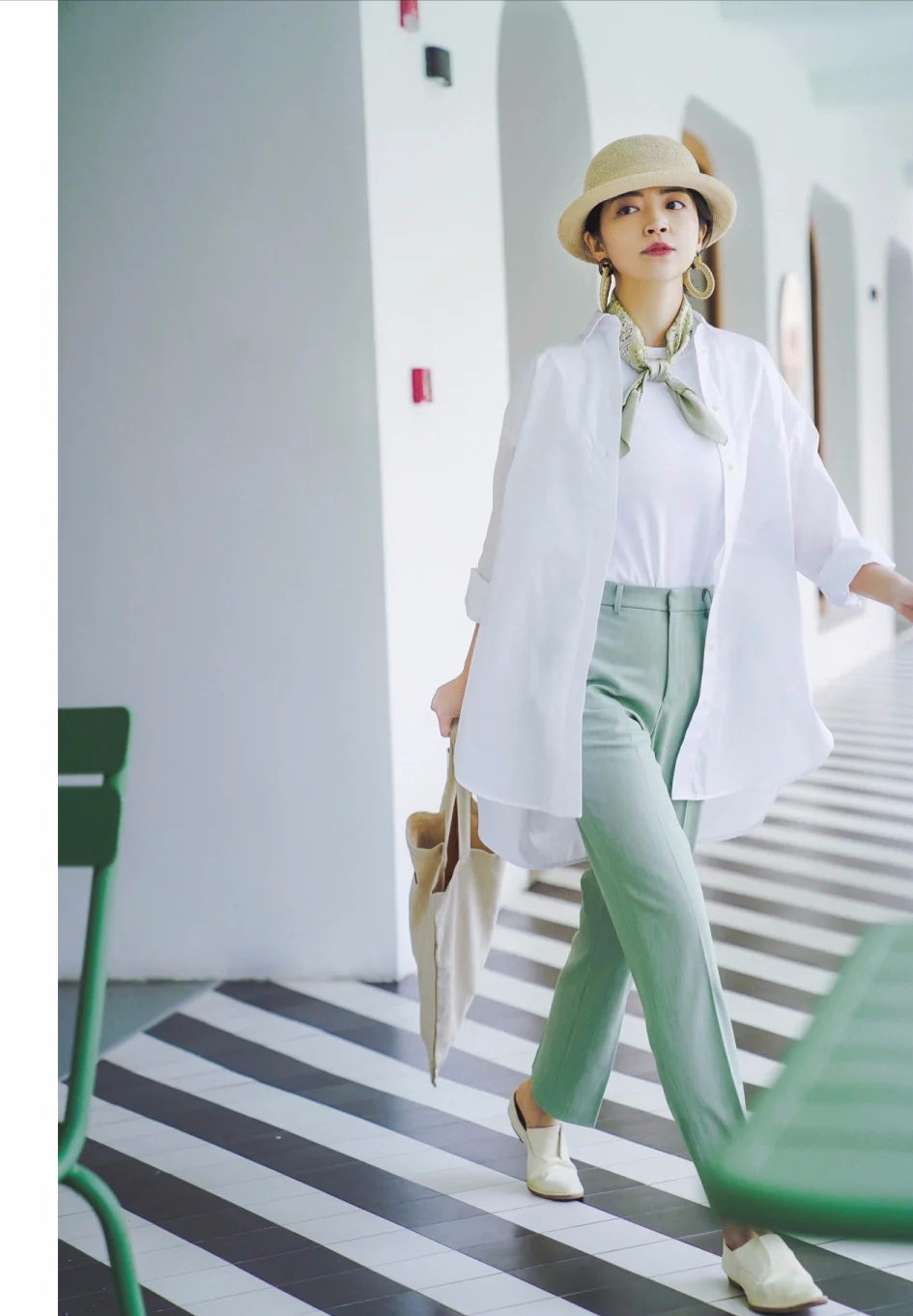 白色的T恤打底,搭配莫蘭迪綠的長褲,將白色襯衫作為外搭敞開穿,一身顯得優雅又富有小清新的畫面感。而絲巾和帽子就是錦上添花的飾品,更凸顯時尚個性。