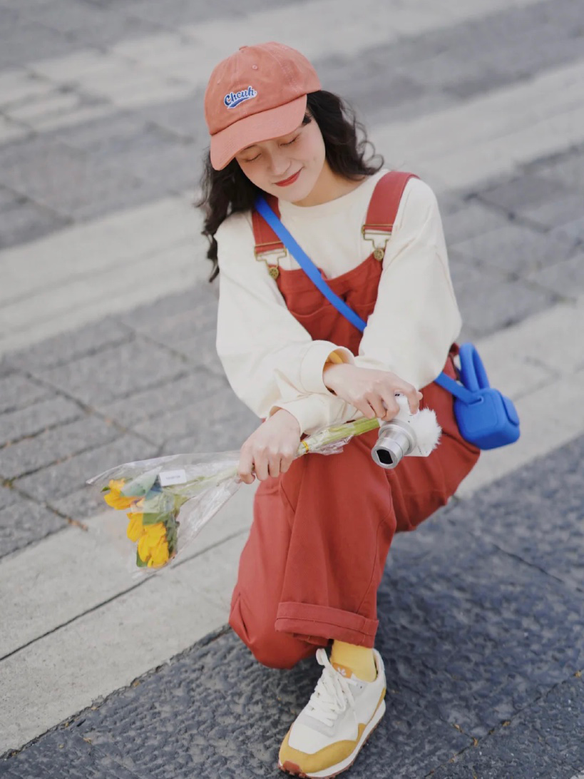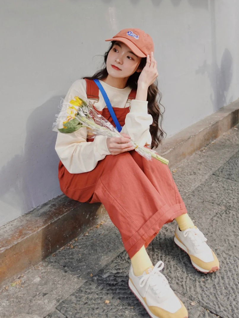 因為衛衣和背帶褲都是最簡單的款式,所以為了增加時髦感,用同色系的帽子和背帶褲做了色彩呼應,整體就很協調~